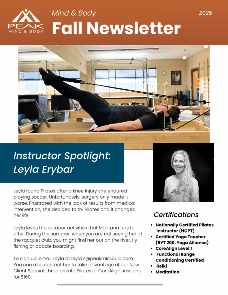 Studio Pilates and CoreAlign sessions are by appointment only. Call (406) 251-3356 ext 170 or email stephanie@peakmissoula.com with any questions.