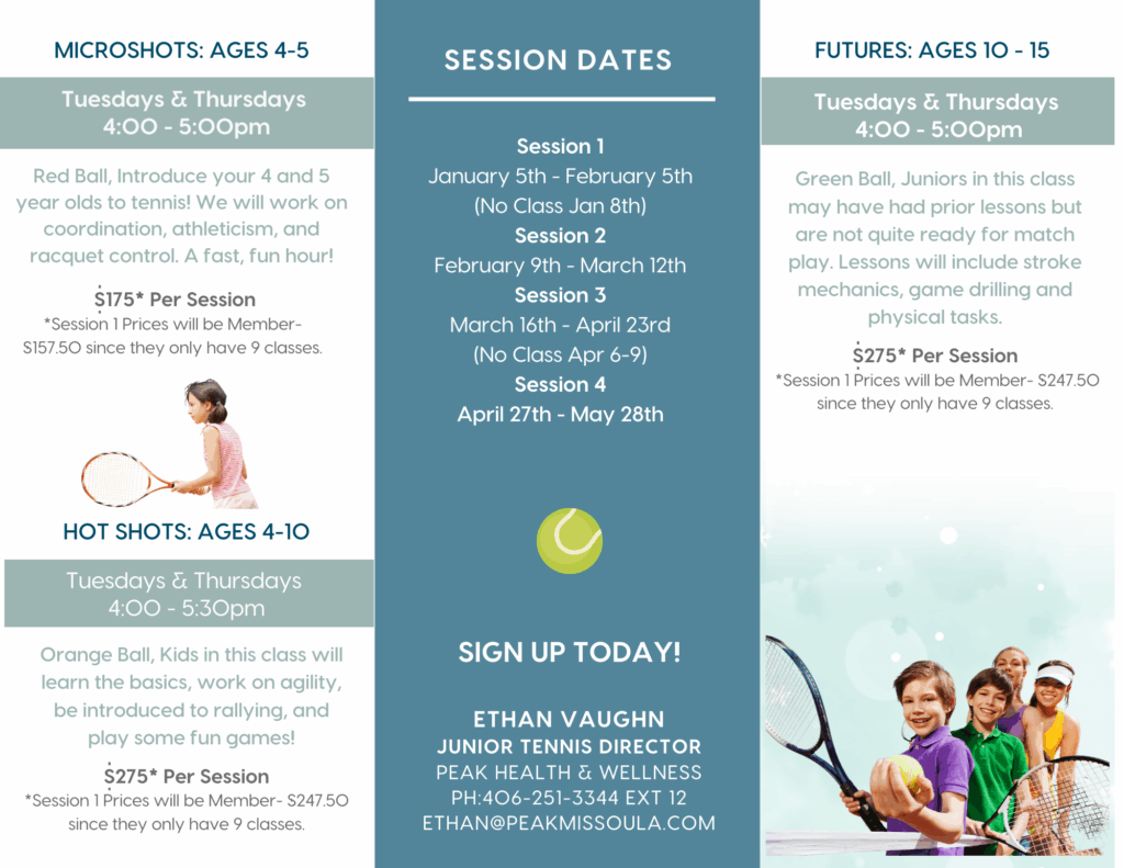 Sign-up opens 2 weeks prior to the session. Contact Ethan Vaughn, Director of Junior Tennis at (406) 251-3355 ext 112 or ethan@peakmissoula.com.
